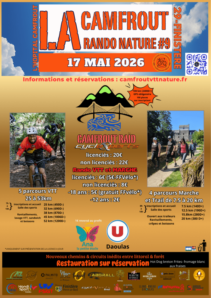 Chaque 1er novembre, le Camfrout VTT Nature vous embarque pour un voyage unique au cœur du Finistère et du Centre Bretagne. Dolmens, menhirs et paysages sauvages jalonnent votre parcours… jusqu’au “Vahala breton”, où vous attendent hébergement, transport des bagages et ravitaillements festifs pour une expérience gravel tout compris.